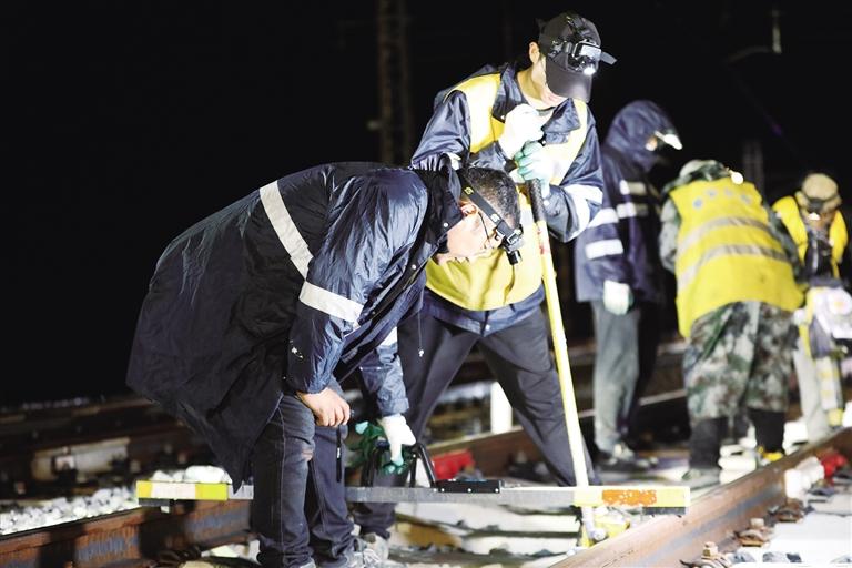 21時30分,作業中,暴雨傾盆而下,瞬間覆蓋了整個施工現場,噼里啪啦地打在現場作業人員身上。早已經歷過無數次風雨洗禮的他們,握緊手中的工具,按照分工忙碌起來,有的測量數據、有的配合作業、有的檢查設備、有的盯控安全……整個作業現場忙而有序,這場突降的暴風雨,儼然已成為促使他們奮進的鼓點,他們正用昂揚的斗志,奏響高原鐵路人的“天路夜曲”。