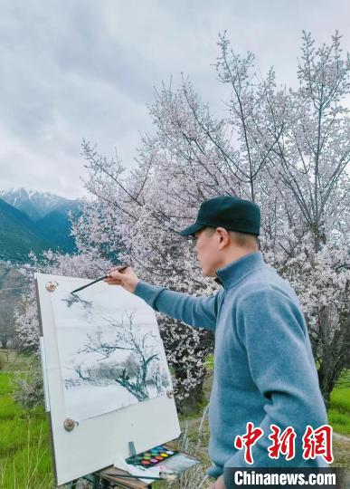 圖為劉洋在林芝寫生。 劉洋 供圖