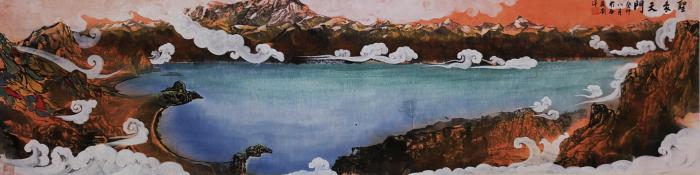 圖為劉洋國畫作品描繪的納木錯圣象天門景觀。 劉洋 供圖