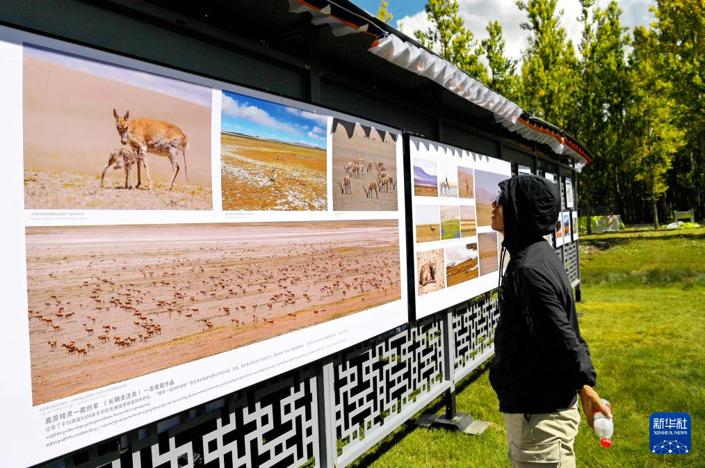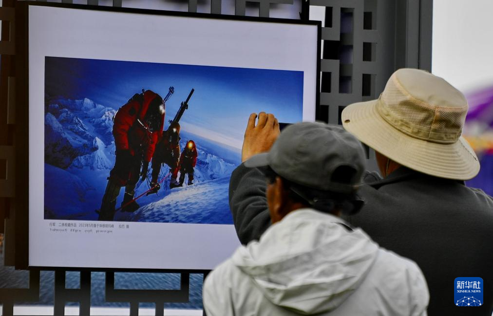 在拉薩市林周縣邊交林鄉當杰村,觀眾在欣賞第十六屆西藏珠穆朗瑪攝影大展作品(9月8日攝)。新華社記者 張汝鋒 攝