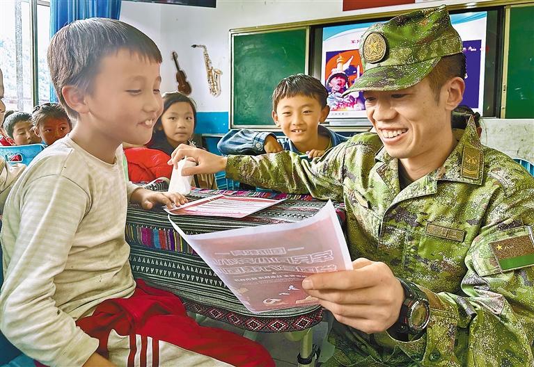 圖為在林芝市墨脫縣格當鄉,駐地官兵為小學生普及國防知識。郎玲 記者 王敏 攝
