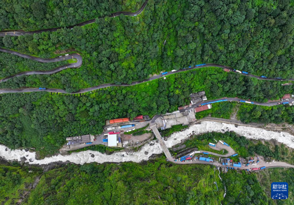 俯瞰樟木口岸的中尼友誼橋和通向樟木鎮(zhèn)的盤山公路(無(wú)人機(jī)照片,9月9日攝)。新華社記者 姜帆 攝