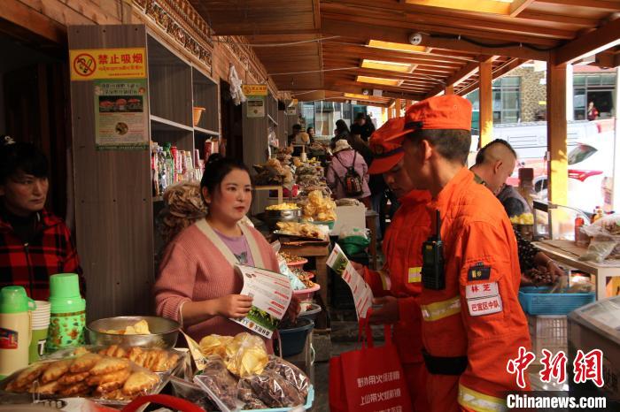 圖為消防員正在為景區商戶普及防火知識。西繞拉翁 攝