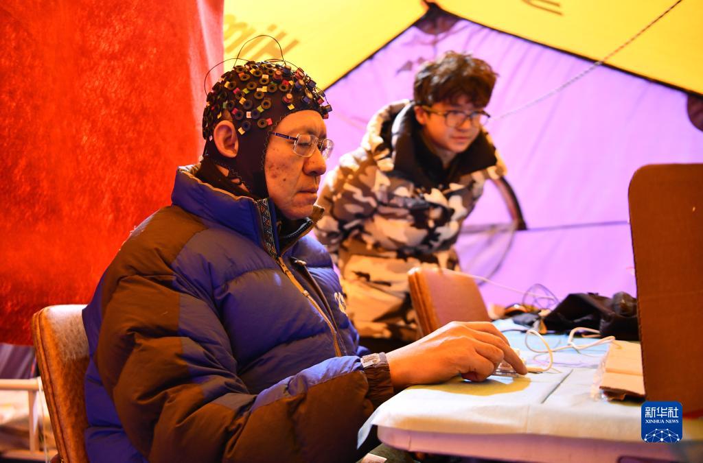 在卓奧友峰登山大本營,中科院院士朱彤佩戴全腦彈性測試帽,測試人體認知能力(10月1日攝)。新華社記者 晉美多吉 攝