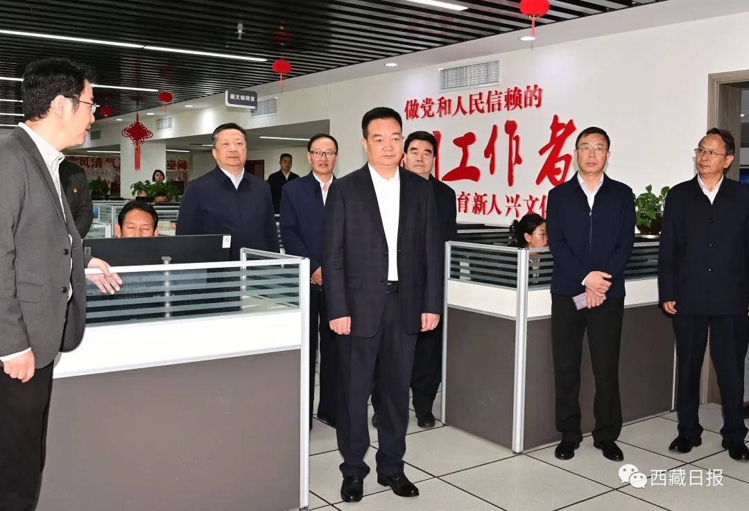 2023年9月25日,自治區黨委書記王君正來到西藏日報社、西藏廣播電視臺調研。這是王君正在西藏日報社詳細了解市場化運營、全媒體傳播體系建設、媒體深度融合發展等情況。記者 旦增西旦 攝