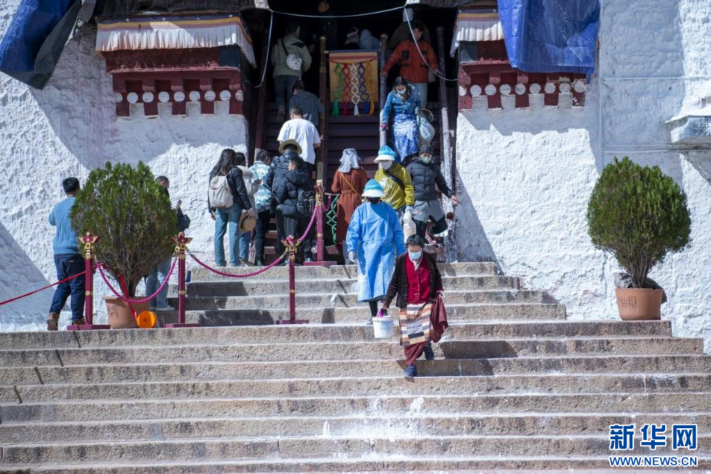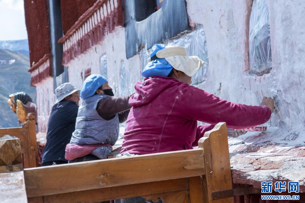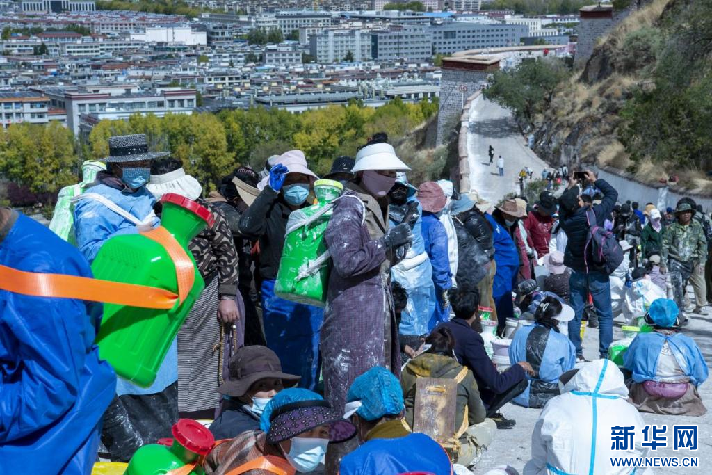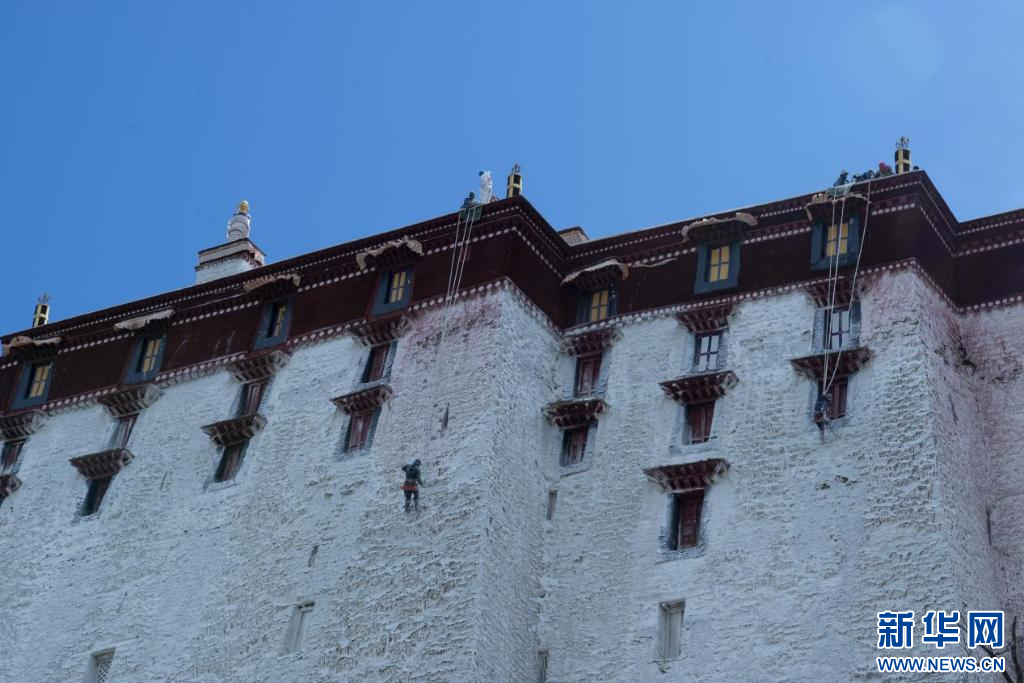 10月18日,布達拉宮“美容師”們在噴灑外墻。新華網 柑丹鴦琦 攝