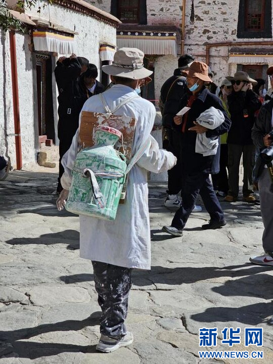 10月18日,布達拉宮“美容師”在噴灑涂料。新華網 柑丹鴦琦 攝