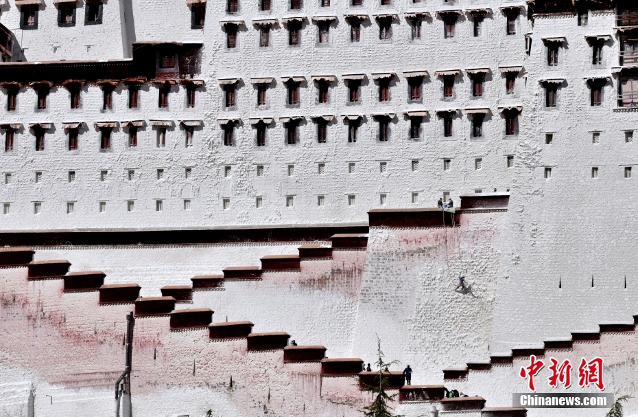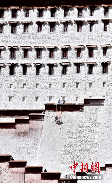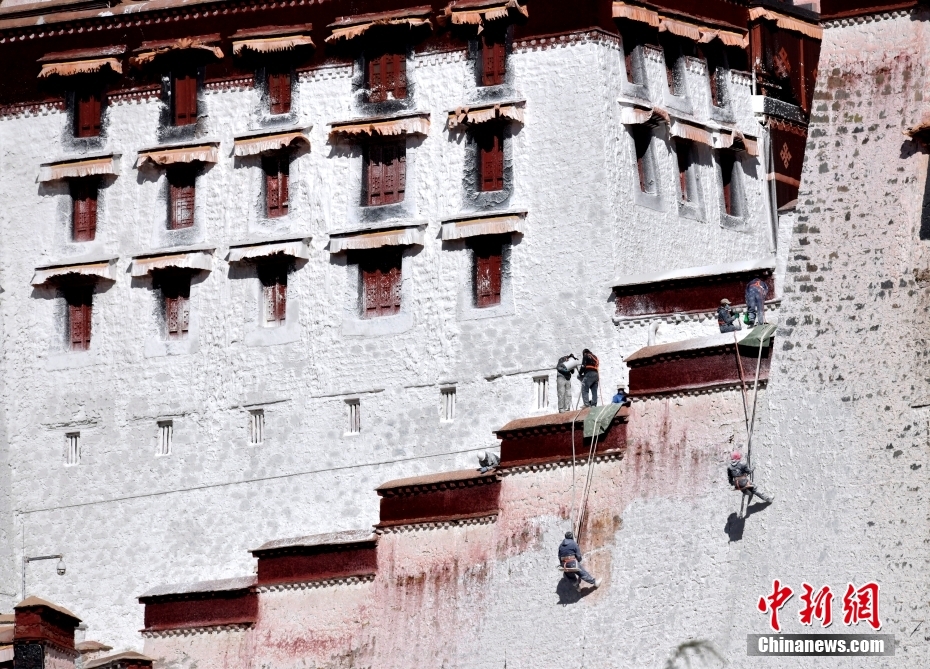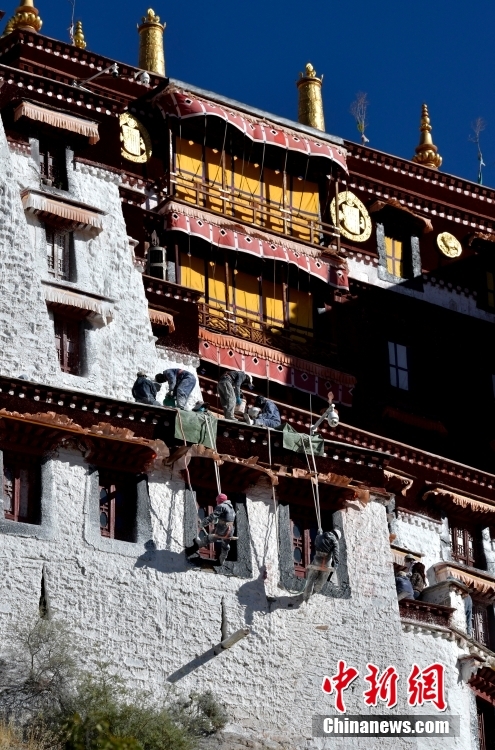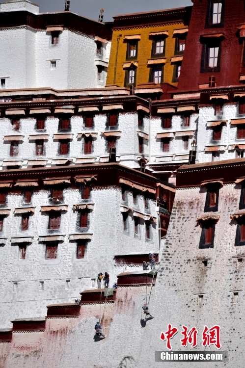 10月19日,西藏拉薩,工作人員對布達拉宮外墻噴灑涂料。每年秋冬交替時節,布達拉宮外墻都要進行粉刷“美顏”。按照慣例,每季粉刷將在藏歷9月22日“神降節”前完成。