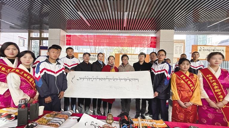 隨后,與會領導向江蘇實驗中學贈送了150套民族團結進步教育讀本。大家一同觀看了書畫社同學現場進行的民族團結進步書畫作品創作。中國書協會員、自治區政協委員、拉薩市政協常委、區市書協副主席南杰旺扎現場創作了“鑄牢中華民族共同體意識”的藏文書法橫幅贈送給江蘇實驗中學。