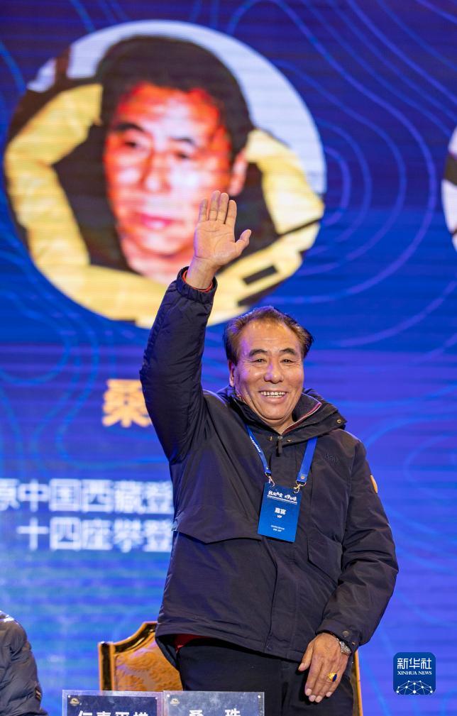 12月11日,原西藏登山隊登頂世界十四座海拔8000米以上高峰探險隊隊長桑珠在交流大會上向觀眾致意。新華社記者 姜帆 攝