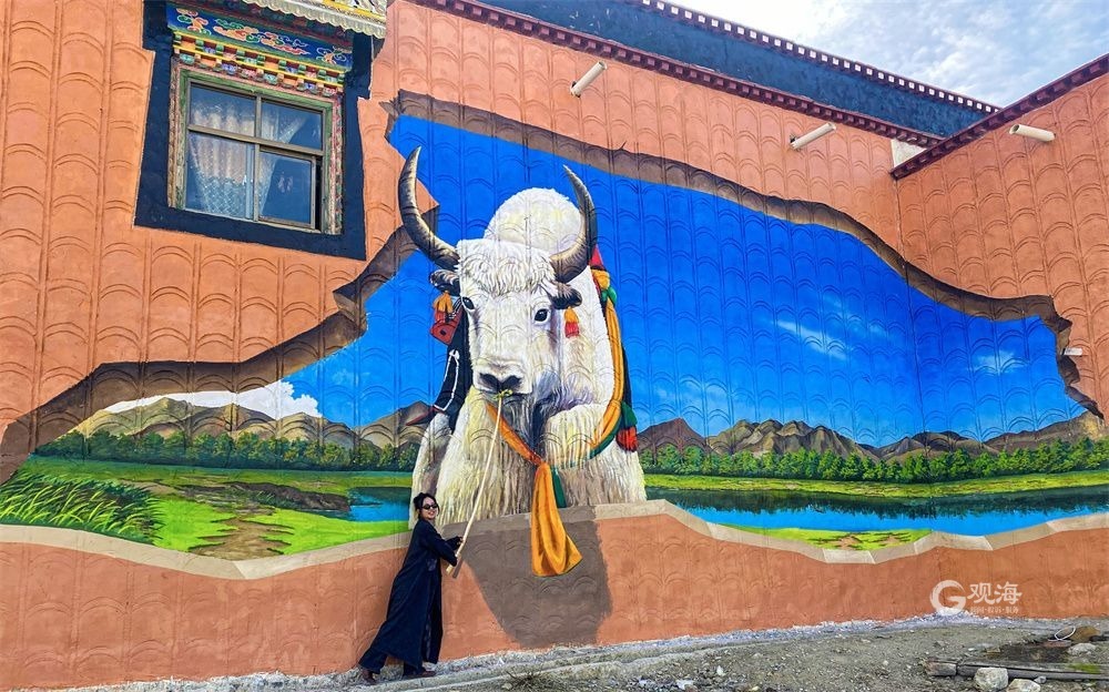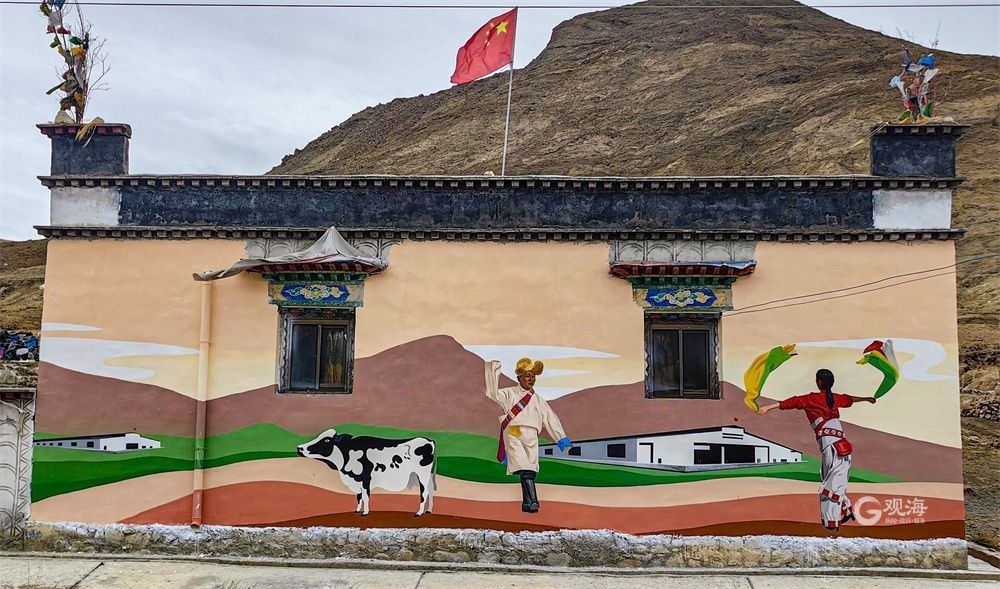 廣袤的高原上,在連綿起伏的山巒之下,是藏族農(nóng)家趕著傳統(tǒng)的“二牛抬杠”耕耘的場景,旁邊的“阿佳”則撒下希望的青稞種子……這樣的場景當(dāng)然不會出現(xiàn)在現(xiàn)在這個滴水成冰的季節(jié),而是躍然于藏家傳統(tǒng)村居的院墻之上。“我家這面墻原來就是貼滿了牛糞,現(xiàn)在畫上了我們平時勞動的景象,感覺比之前更好看了。”桑珠孜區(qū)東嘎鄉(xiāng)色定村的村民旦瓊說,此前的一年又一年,他都是把牛糞貼在墻上,固然有傳統(tǒng)的高原美感,但是與現(xiàn)在院墻上畫的鄉(xiāng)村振興的場景相比,還是現(xiàn)在的感覺更不錯。