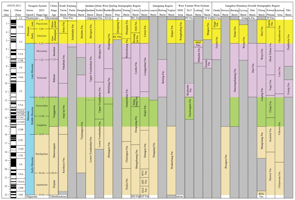 中國的新近紀年代地層系統分為中新統的謝家階、山旺階、通古爾階、灞河階、保德階5個階,以及上新統的高莊階和麻則溝階2個階。研究提出,在青藏高原新生代陸相地層的劃分對比和測年標定上,哺乳動物化石起到非常重要的作用。