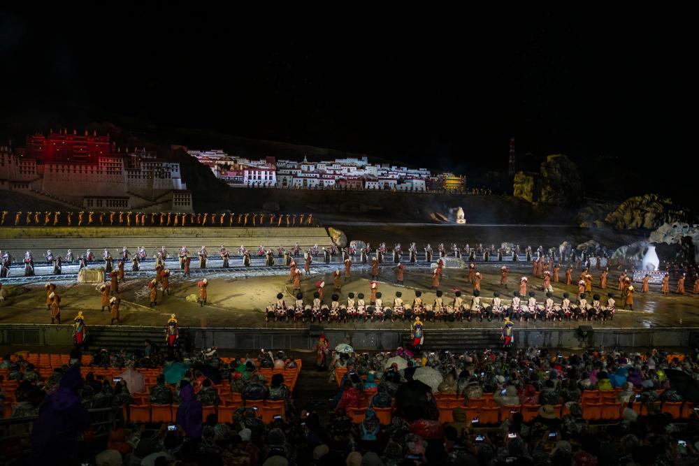 夜幕降臨,實(shí)景劇《文成公主》以現(xiàn)代歌舞劇藝術(shù)形式,講述當(dāng)年文成公主與松贊干布和親的歷史故事。大唐歌舞和藏戲的融合,舞臺(tái)藝術(shù)與自然山川的呼應(yīng),歷史人物與美好主題的展示,讓人領(lǐng)略不一樣的西藏文化。全劇有近800名演職人員。除專職演員外,很多藏族農(nóng)牧民參與演出,有效促進(jìn)當(dāng)?shù)厝罕娋蜆I(yè)增收。