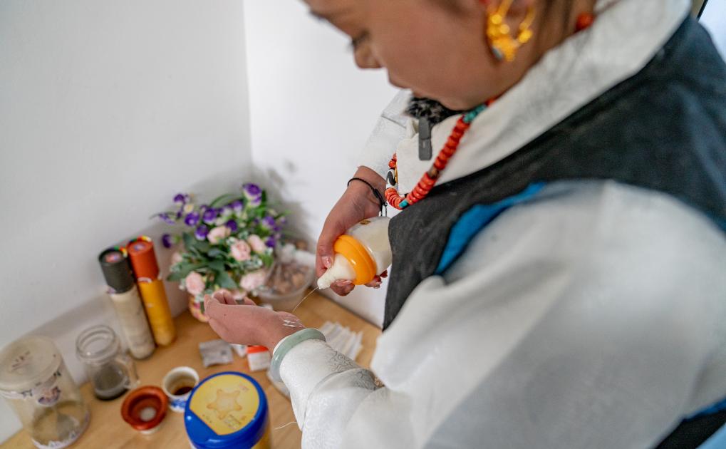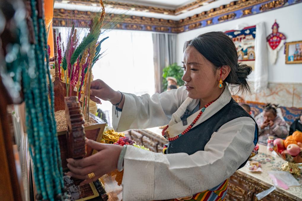 1月8日,愛心媽媽旦增卓瑪在擺放切瑪(五谷斗)。新華社照片,拉薩,2024年1月9日 新華社發(丁增尼達攝)