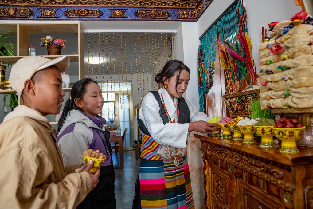 1月8日,愛心媽媽旦增卓瑪和孩子們擺放新年供品。新華社照片,拉薩,2024年1月9日 新華社發(丁增尼達攝)