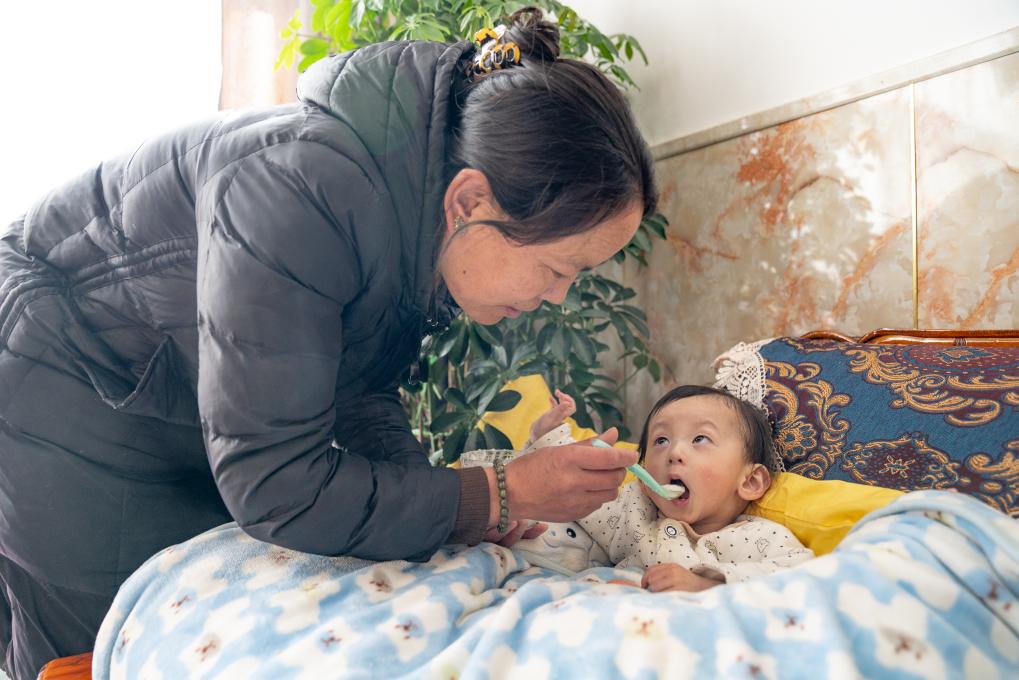 1月8日,愛心媽媽巴桑在給一歲半的拉巴扎西喂飯。新華社照片,拉薩,2024年1月9日新華社發(丁增尼達攝)