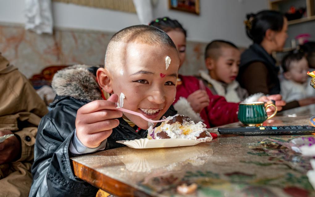 按慣例,今天是福利院孩子們吃新年蛋糕的日子。一首《新年好》唱罷,孩子們開心地吹滅蠟燭,吃起了蛋糕。今年也是巴桑在這個“家”里度過的第18個藏歷農家新年。