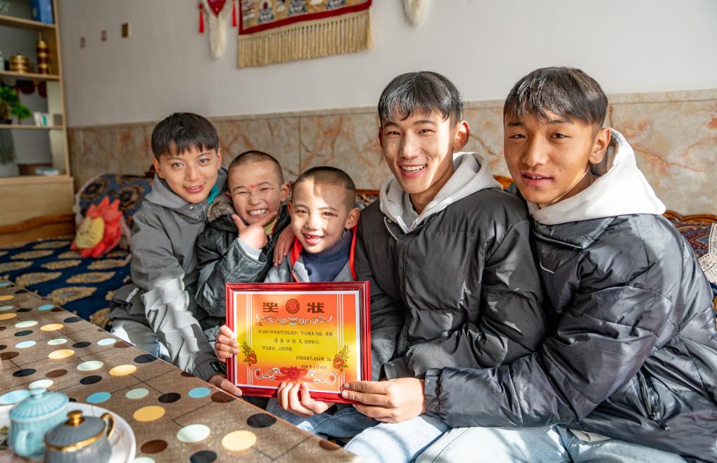 1月8日,“幸福家庭”的孩子們展示獎狀。新華社照片,拉薩,2024年1月9日 新華社發(丁增尼達攝)