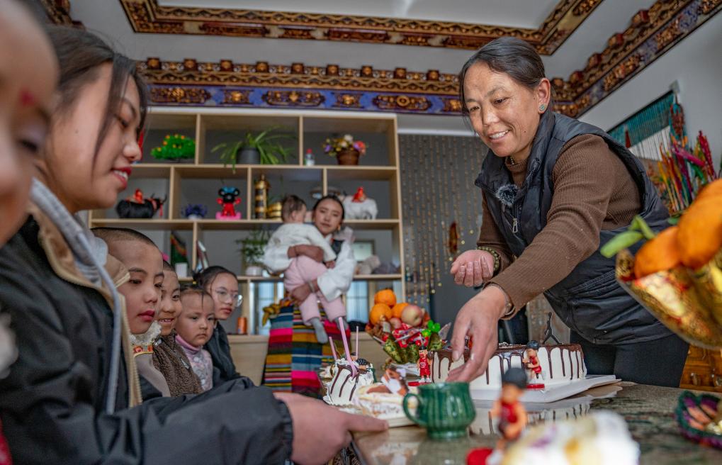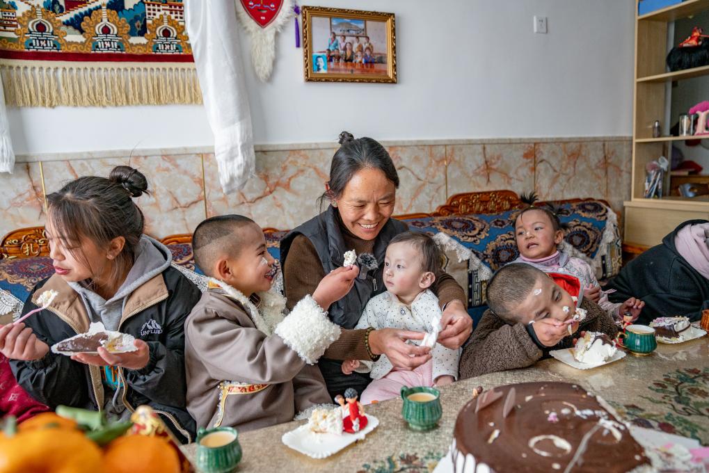 1月8日,愛心媽媽巴桑和孩子們一起吃蛋糕。新華社照片,拉薩,2024年1月9日 新華社發(丁增尼達攝)