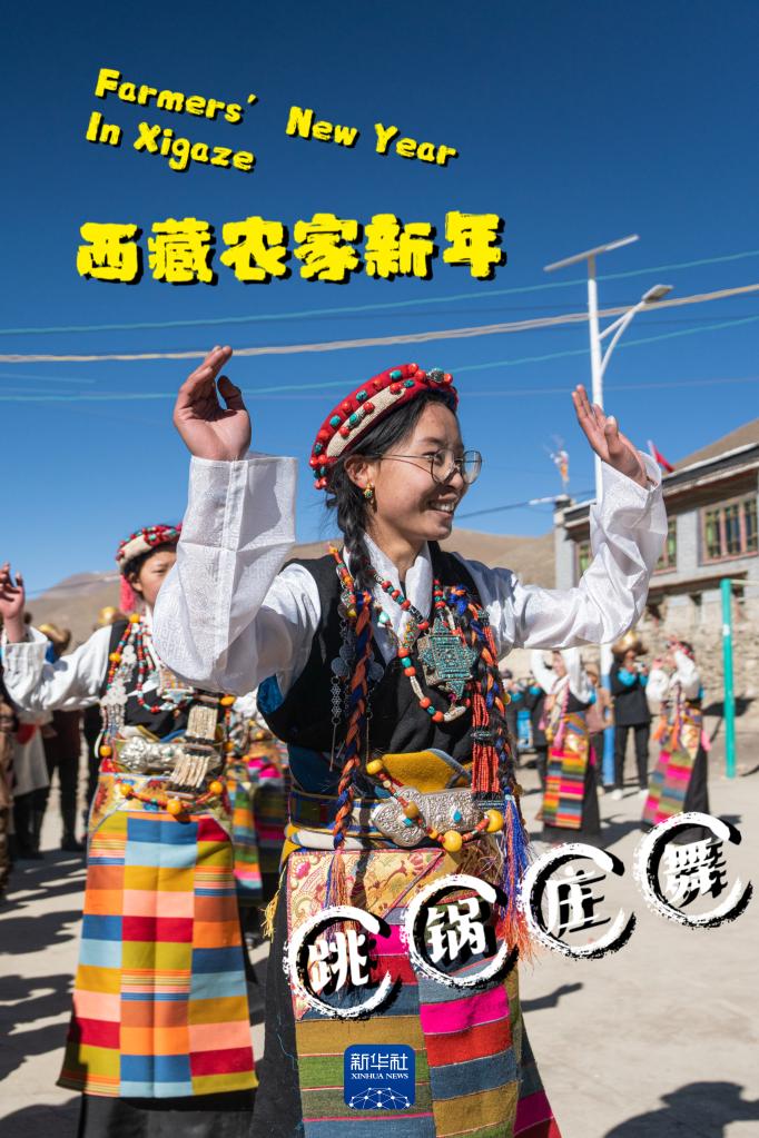 日喀則市白朗縣東喜鄉思古龍村男女老少齊出動,跳起歡快的鍋莊舞辭舊迎新(1月13日攝)。