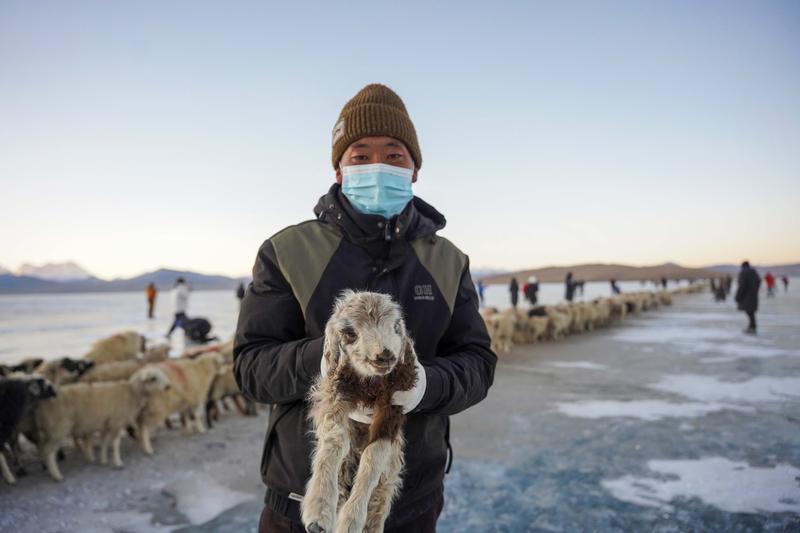 早上8點左右,趕羊正式開始。幾名牧羊人先行一步在冰面撒上爐灰,一名牧羊人抱著小羊踏上冰面,身后是羊群在冰湖上緩慢前行。還有兩名牧羊人牽著牧羊犬,與其他牧羊人一起分列兩側,維持秩序。