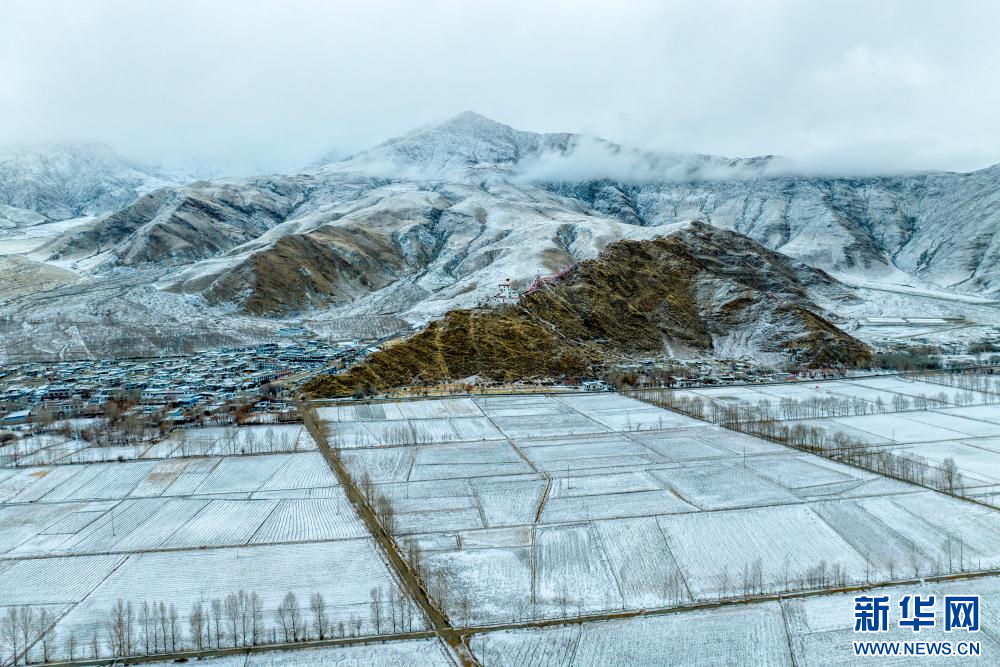 2月15日拍攝的雪后雍布拉康和山腳下的村莊(無人機照片)。新華網 旦增努布 攝