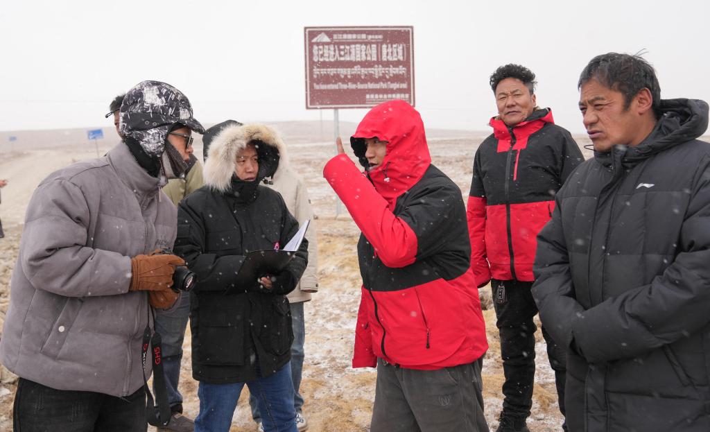 新華社記者(左二)在三江源國家公園(唐古拉山北部片區)采訪。新華社記者 晉美多吉 攝
