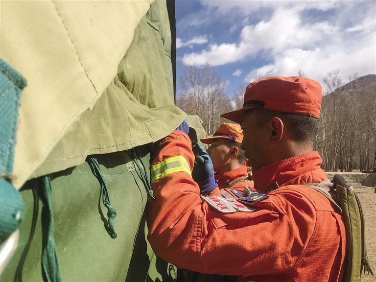 指戰員們在搭建帳篷。記者 桑旦歐珠 攝