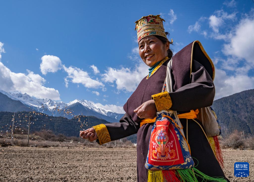 當日是西藏農民舉行一年一度春耕大典的日子。村民沿襲著傳承千年的春耕民俗,身著節日盛裝,手捧“切瑪”(五谷豐登斗),唱起祈愿歌,互敬青稞酒。當鐵犁翻開土地,婦女將手中的種子撒下,祈求新的一年豐收。