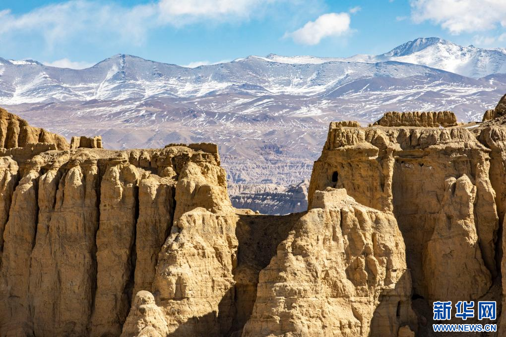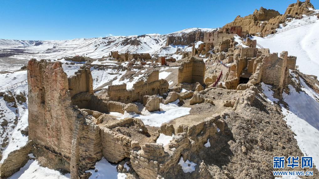 達巴遺址位于西藏阿里地區札達縣境內,其主要建筑分布在兩座山脊之上,整個遺址共有洞穴200余處,且有獨立的碉樓、寺廟建筑遺跡、居民窯洞等建筑,在白雪的映襯下,顯得格外雄渾而神秘。