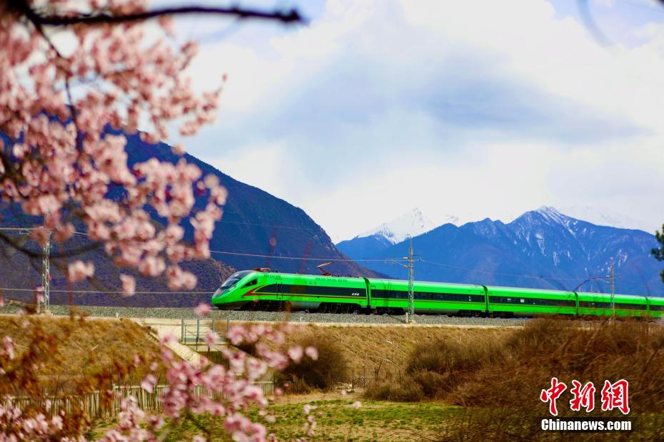 被譽為新“天路”的拉林鐵路,是中國首條高原電氣化鐵路,于2021年6月25日開通運營,結束了西藏東南地區(qū)不通鐵路的歷史。圖為拉林鐵路沿線桃花盛開,與飛馳而過的動車構成別樣風景圖。馬生明 攝