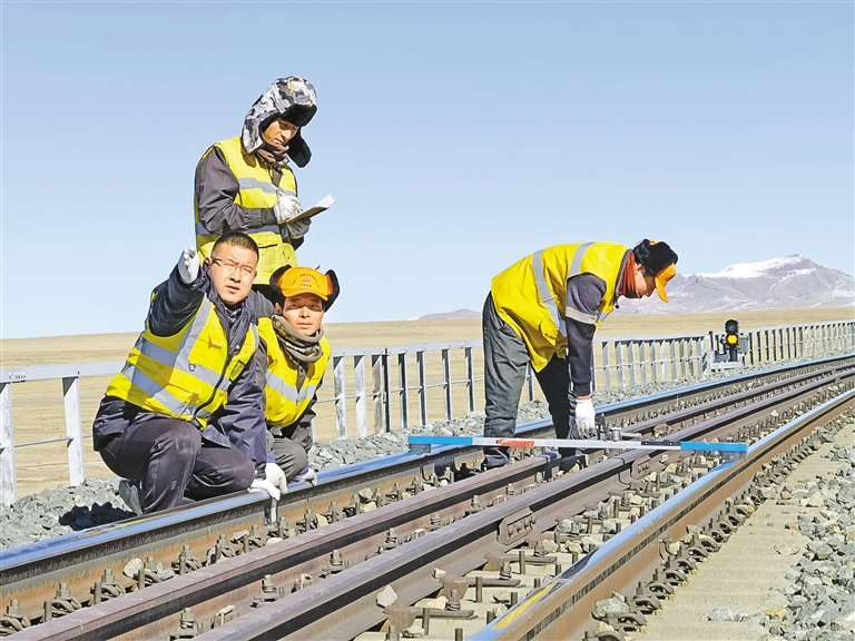 圖為高錢勝(左一)和他的團隊在青藏鐵路多年凍土區(qū)段進行路基病害整治和檢查。