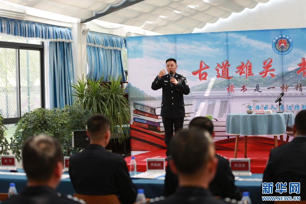 在“古道雄關 書香國門”主題讀書分享會上分享者黃耀軍正在向全站移民管理警察分享讀書心得(4月19日攝)。肖富貴 攝