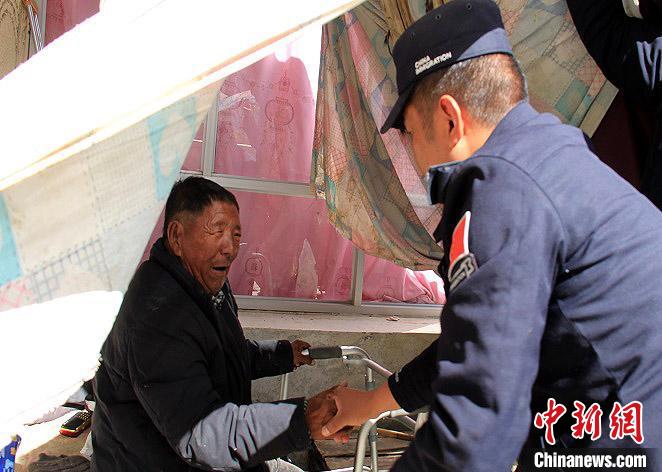 圖為民警上門為桑珠老人服務。次仁頓珠 攝
