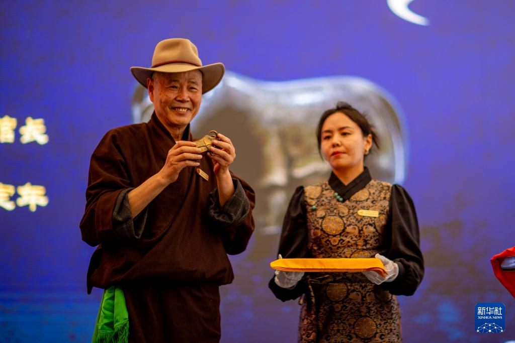 5月18日,吳雨初(左)在西藏牦牛博物館捐獻自己珍藏的銅牦牛文物。新華社記者 姜帆 攝
