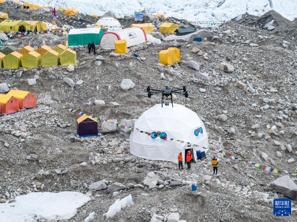 4月30日,大疆運(yùn)載無人機(jī)在珠穆朗瑪峰南坡大本營(yíng)進(jìn)行物資運(yùn)輸測(cè)試(視頻截圖)。新華社發(fā)