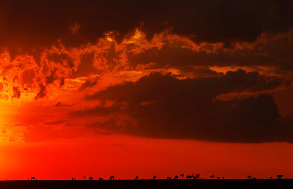 ↑ 在馬賽馬拉國家保護區,遷徙中的野生動物在夕陽下覓食。