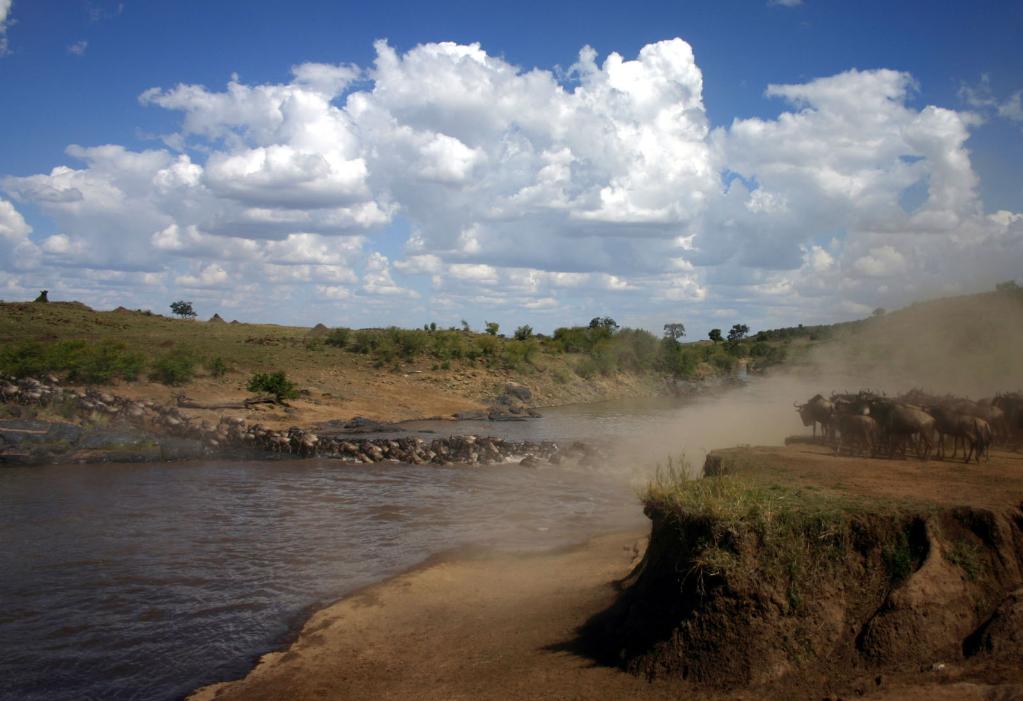 ↑ 在馬賽馬拉國家保護區,遷徙中的角馬越過馬拉河。馬拉河“生死之渡”是整個大遷徙過程中最為壯觀和驚心動魄的一幕。