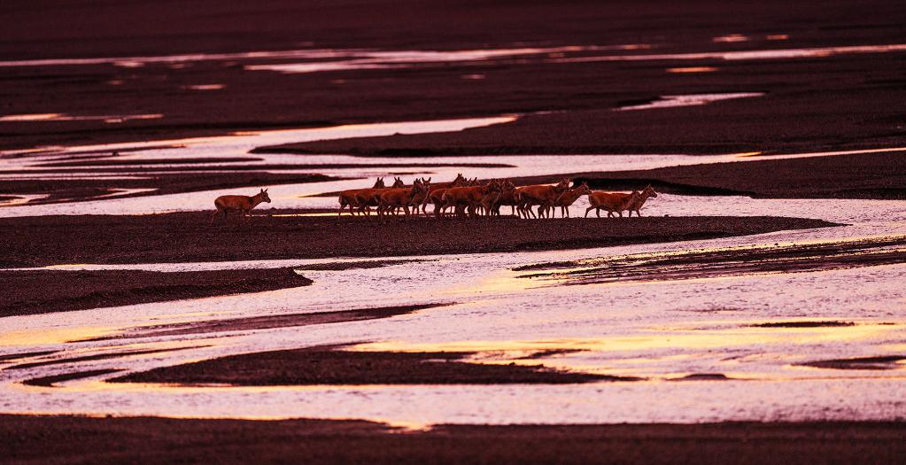 ↑ 在羌塘國家級自然保護區,藏羚羊越過甜水河,前往“產房”。