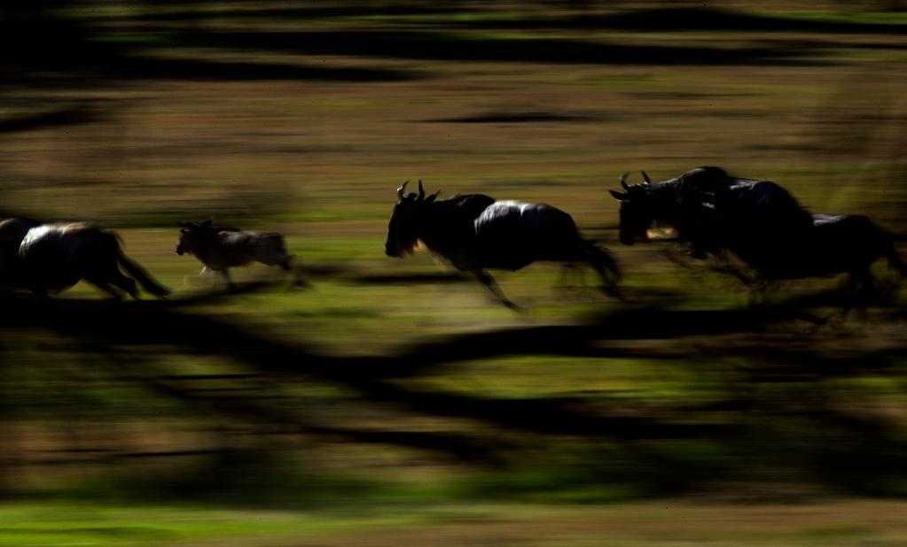 ↑ 在馬賽馬拉國家保護區,遷徙中的角馬因為感受到某種危險而奮力奔跑。