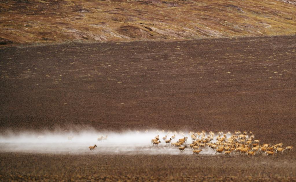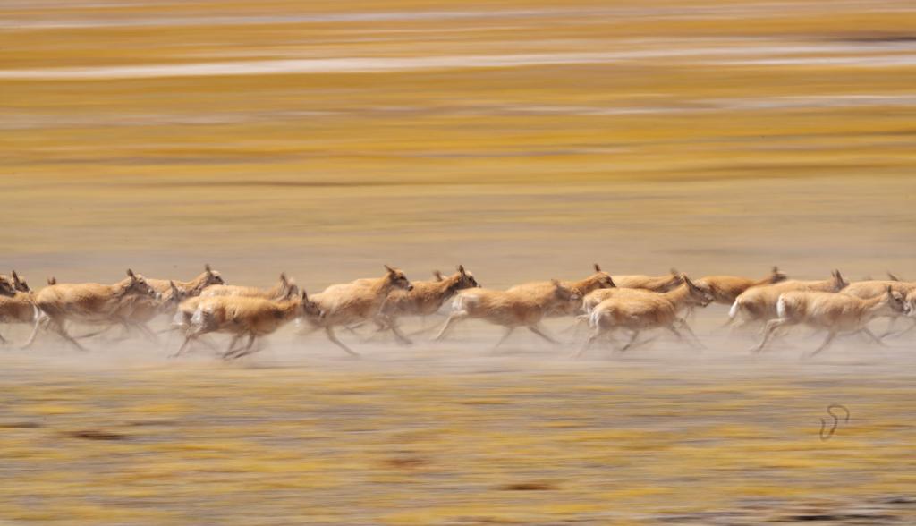↑ 在羌塘國家級自然保護區,遷徙中的藏羚羊因為感受到危險而奮力奔跑。