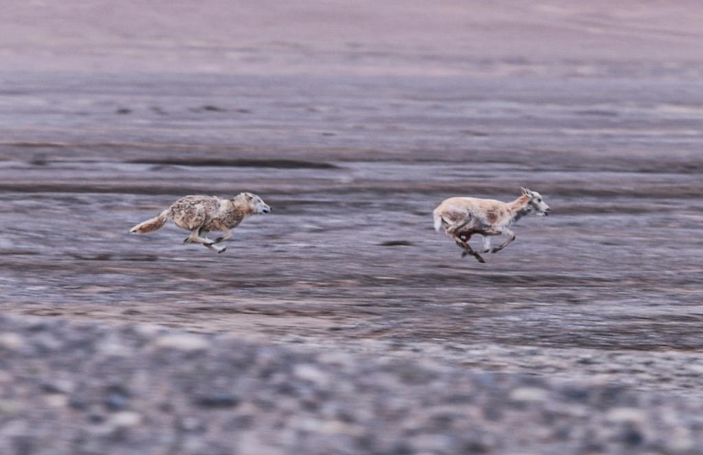 ↑ 在羌塘國家級自然保護區,一只野狼正在捕食遷徙中的母藏羚羊。在藏羚羊的遷徙過程中,野狼、雪豹、藏馬熊和藏野狐等掠食動物守候在遷徙路上,隨時準備捕食。