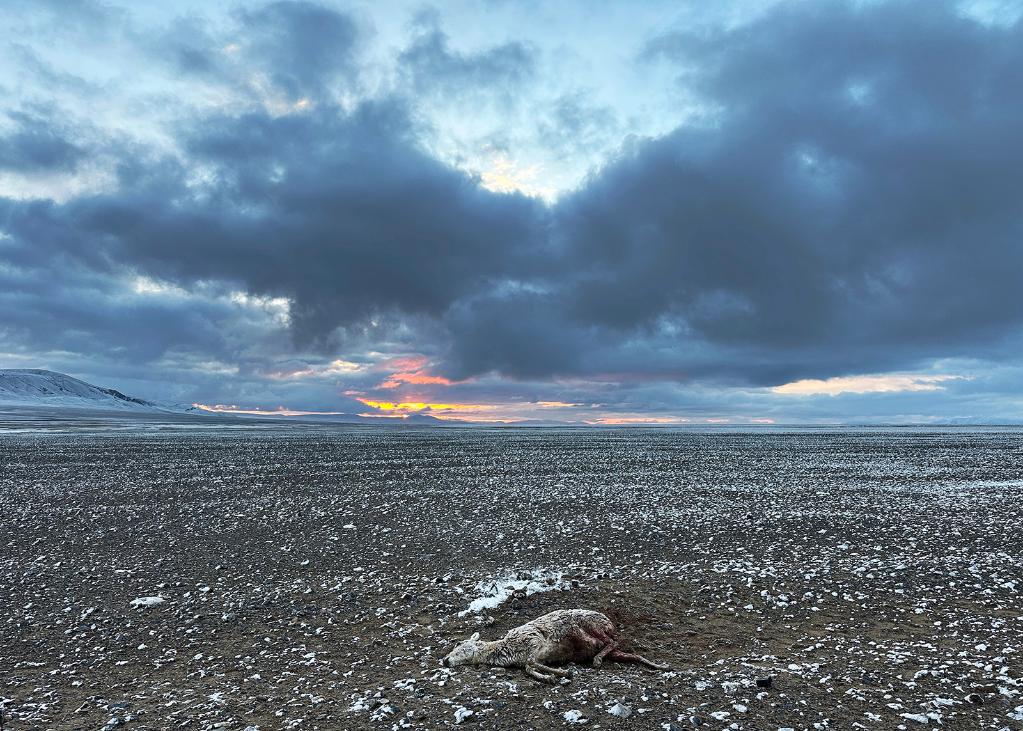 ↑ 在羌塘國家級自然保護區,一只被野狼咬死的母藏羚羊躺在雪后的草原上。