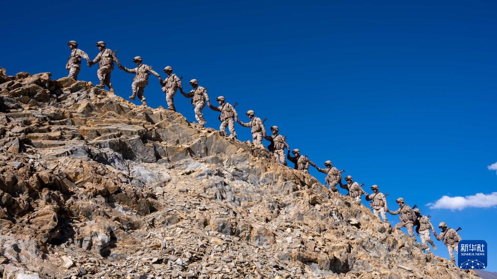 西藏阿里軍分區普爾楚邊防連秋迪儉革拉哨所巡邏官兵前往海拔5700米的點位進行巡邏(6月29日攝)。新華社發(戴學武 攝)