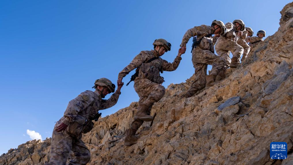 西藏阿里軍分區普爾楚邊防連秋迪儉革拉哨所巡邏官兵在巡邏途中爬越陡峭山坡(6月29日攝)。新華社發(戴學武 攝)