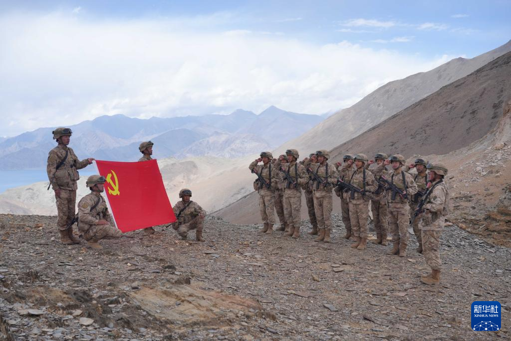 西藏阿里軍分區普爾楚邊防連秋迪儉革拉哨所巡邏官兵在海拔5700米的巡邏點位組織重溫入黨誓詞活動(6月29日攝)。新華社發(戴學武 攝)