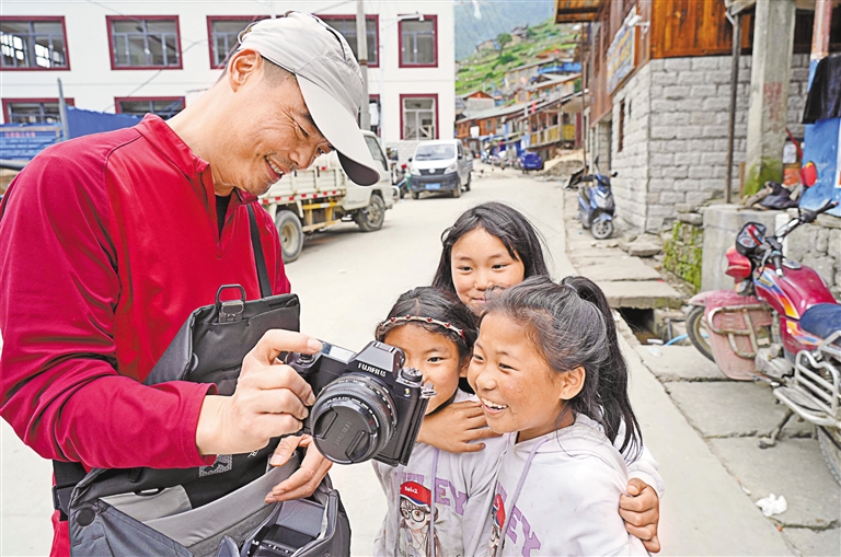 圖為日喀則市文聯采風團成員在陳塘鎮向小朋友展示采風照片。