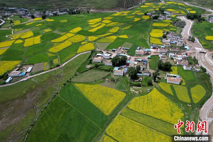 盛夏,西藏墨竹工卡油菜花盛放,一片金黃,風光宜人。油菜花與綠油油的青稞地以及藏式民居,共同繪就鄉村美麗畫卷。圖為7月10日,拉薩市墨竹工卡縣油菜花盛放。(無人機照片)中新社記者 李林 攝