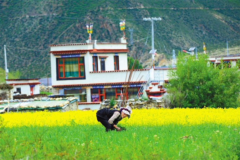 墨竹工卡縣扎雪鄉龍珠崗村村民在田里拔草。