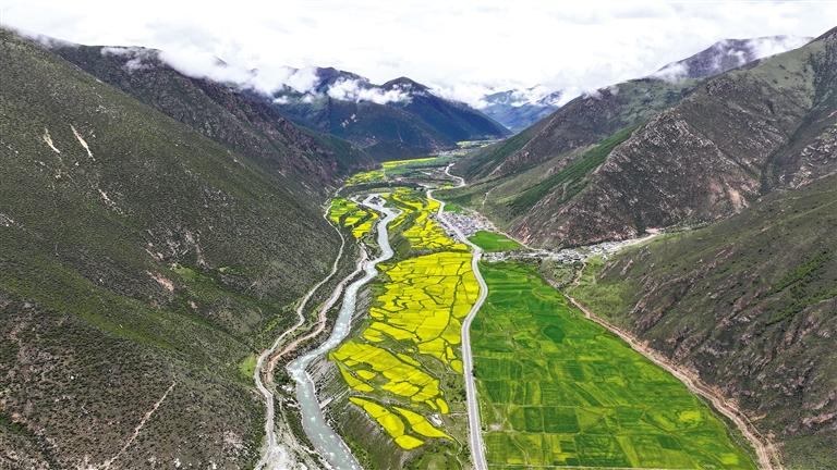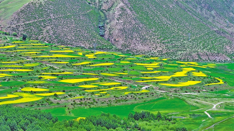 最近,墨竹工卡縣迎來了油菜花的盛開時節。放眼望去,滿目的油菜花如同金黃色的毯子般鋪展開來,在微風中搖曳,散發出迷人的香氣。一團團、一簇簇的金黃色花朵點綴在田野上,流動著濃濃夏意。成片的花海與蜿蜒的農村公路、錯落有致的村居共同構成了一幅和諧美麗的田園風景圖。